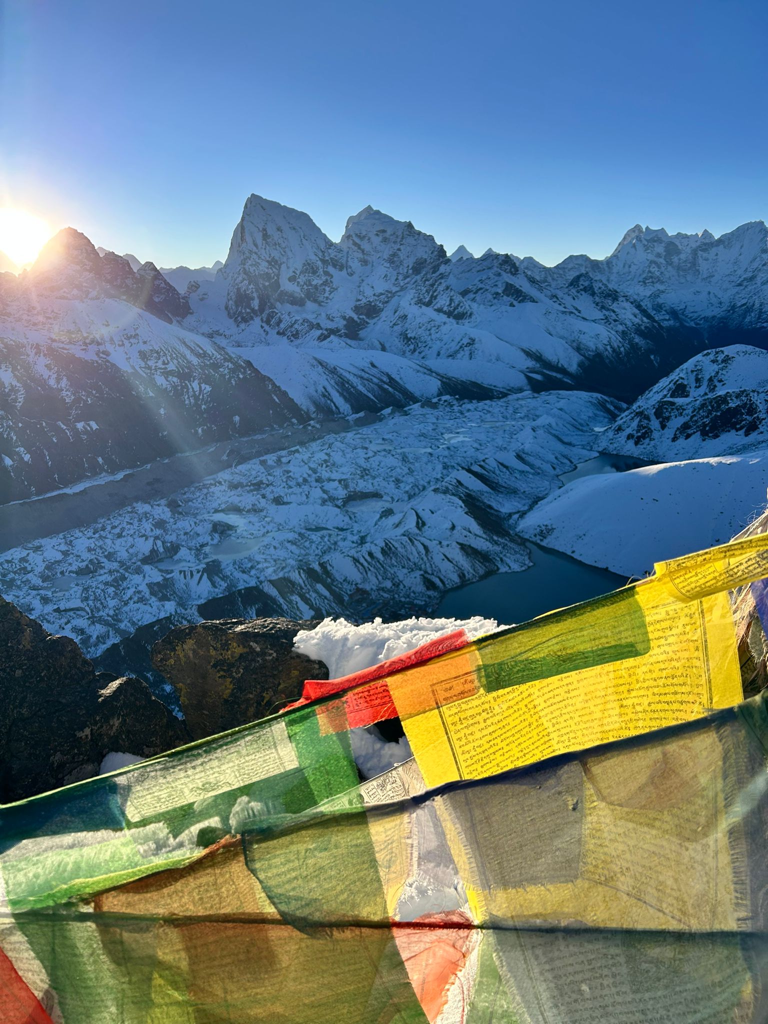 Pod Tobą błyszczą niczym klejnoty turkusowe jeziora Gokyo, a lodowe rzeki rzeźbią krajobraz pełen dzikiego piękna. Daleko w dole migoczą buddyjskie chorągwie modlitewne, tańczące na wietrze.